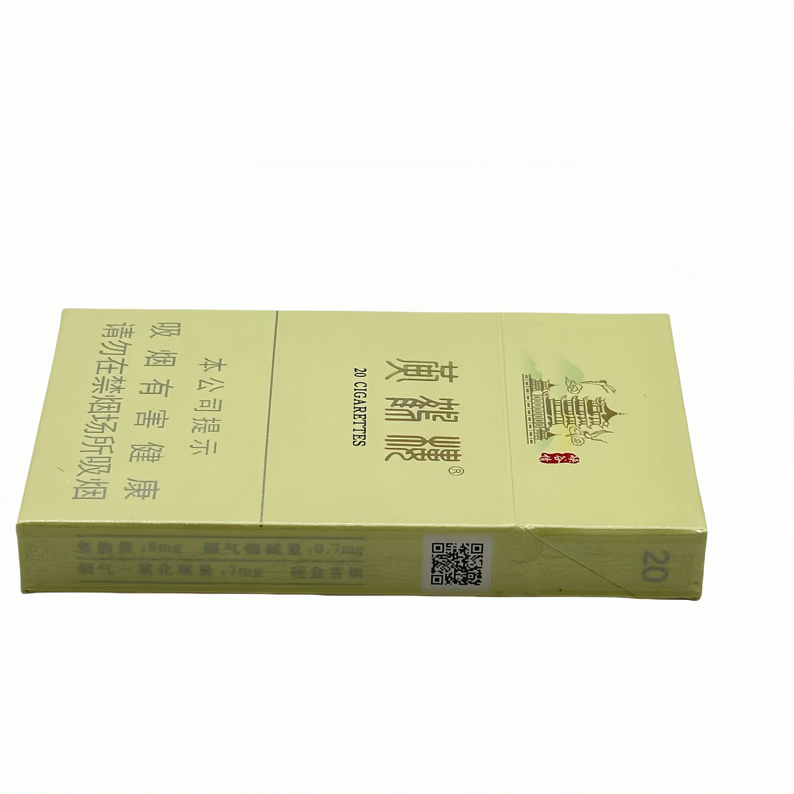 峡谷情细支烟盒以柔白色为主基调,搭配鎏金品牌标识与峡谷纹饰,采用珠光白卡纸,触感细腻,整体简约而不失高级感。盒面上方,经典的黄鹤楼图案以烫金工艺呈现,飞檐翘角、楼阁层叠,搭配“峡谷情”小巧印章,古雅韵味与产品主题交融。